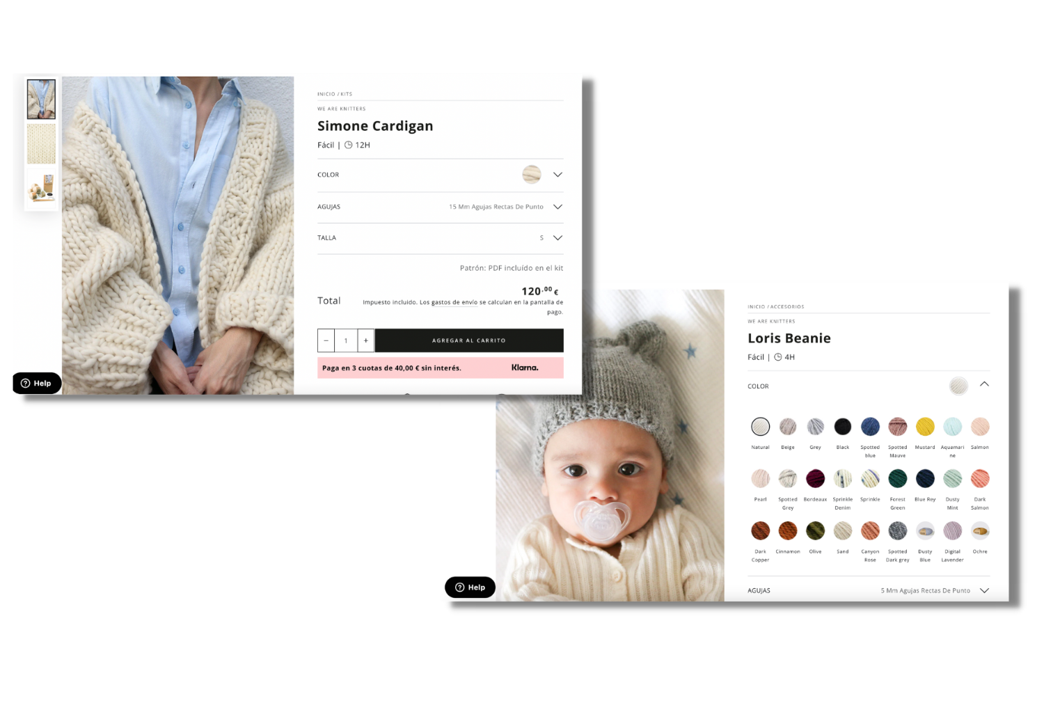 Uno de los mayores desafíos del proyecto fue ofrecer una solución para la creación de kits personalizados. Para abordar esta necesidad, desarrollamos una aplicación que permite la creación de kits de tejer personalizados. Cada kit ofrece una selección de colores prácticamente ilimitada, tipos de agujas, patrones digitales, precios dinámicos y cantidades variables de colores por tamaño. La capacidad de seleccionar entre todas estas opciones y enviar la información correcta a los almacenes fue uno de los mayores desafíos del proyecto. Para lograrlo, diseñamos metaobjetos personalizados asociados a productos y creamos un front-end personalizado que maneja la lógica de selección.